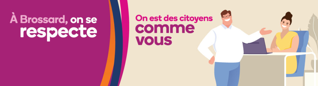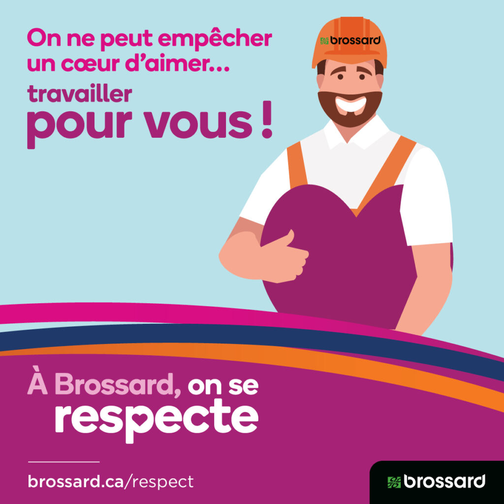 En mars 2022, à la suite de la pandémie, nous souhaitions rappeler que nous sommes tous humains et que nous sommes tous dans le même bateau, la Ville de Brossard a donc lancé la campagne « À Brossard, on se respecte ». Cette campagne visait et vise toujours à renforcer le lien entre les employés, les élus et les citoyens, à sensibiliser à la réalité que vivent le personnel et les élus de la Ville et à démystifier un peu les rôles qu’ils occupent au service de la population.