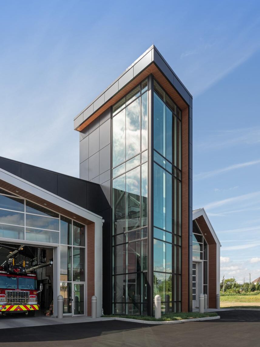 Caserne 44, located at 2655 boulevard Matte in Brossard, is a new-generation institutional infrastructure. Built in collaboration with Groupe Leclerc architecture + design and under the responsibility of the Agglomération de Longueuil, it stands out as the first fire station in Quebec to offer a complete decontamination pathway. Designed to the highest standards of performance, functionality and durability, it provides exemplary working conditions for fire safety personnel.